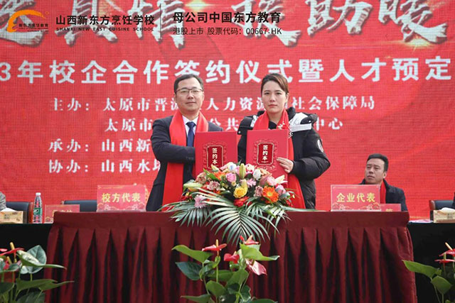 太原市晉源區(qū)人社局黨組成員王永劭、晉源區(qū)職業(yè)能力建設(shè)科科長(zhǎng)郭鵬、山西新東方烹飪職業(yè)培訓(xùn)學(xué)校校長(zhǎng)助理孟慶柱、山西水塔醋業(yè)股份有限公司總經(jīng)理張策、校區(qū)各部門負(fù)責(zé)人以及省內(nèi)外合作企業(yè)代表等共同出席了此次盛會(huì)。據(jù)悉,經(jīng)過(guò)校企雙方領(lǐng)導(dǎo)在不同層面進(jìn)行密集的接洽與溝通,此次簽約,雙方將本著“資源共享、優(yōu)勢(shì)互補(bǔ)、互利互惠、共同發(fā)展”的原則,主動(dòng)適應(yīng)餐飲產(chǎn)業(yè)發(fā)展的需要,實(shí)現(xiàn)產(chǎn)業(yè)鏈與教育鏈之間的優(yōu)勢(shì)互補(bǔ),在包括中餐、西餐、西點(diǎn)等方面開(kāi)展合作共建。