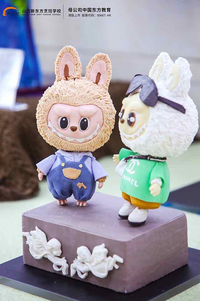 翻糖蛋糕區(qū)則把西點的“觀賞性”與“潮流感”拉滿,系列“拉布布”主題作品成為全場焦點。雪白糖膏塑出的圓潤耳朵、蓬松裙擺自帶萌態(tài),粉色糖霜勾勒的腮紅與蝴蝶結細膩傳神,連拉布布爪子上的絨毛紋理都清晰可見,靈動得仿佛下一秒就要跳出展臺。這般巧思并非偶然,學校翻糖專項課程構建了從基礎到高階的完整培養(yǎng)體系:從糖膏調制、基礎塑形的扎實訓練,到角色設計、細節(jié)雕刻的進階學習,更緊跟市場趨勢引入IP聯(lián)名理念,讓學子的作品既具藝術質感,又能精準戳中當下消費者的審美偏好,自帶話題熱度。