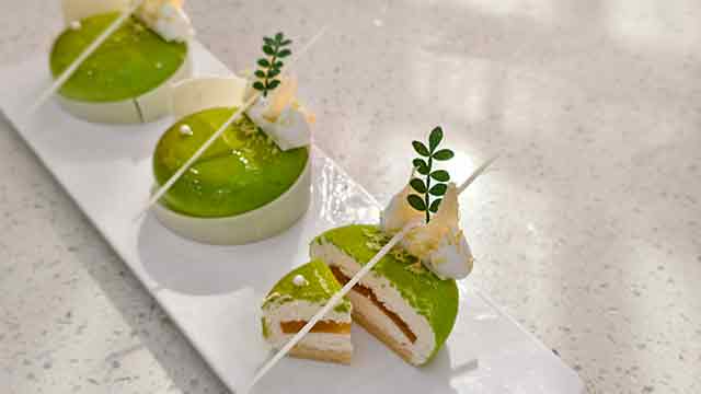 步入展臺現(xiàn)場,數(shù)十款法式慕斯甜品錯落陳列,瞬間讓人仿佛置身巴黎街頭的精致甜品店。鏡頭拉近,淋著鏡面釉的慕斯蛋糕最為吸睛——深咖色的歌劇院慕斯泛著綢緞般的光澤,輕輕晃動便折射出細(xì)膩光影;淡粉色的草莓慕斯表面,新鮮草莓片與薄荷葉錯落點綴,顏值與清新感兼?zhèn);還有融合了當(dāng)下流行元素的低糖抹茶慕斯,淺綠底色搭配金色糖針,簡約又高級。每一款作品都層次分明,切開后可見細(xì)膩的慕斯體、醇厚的夾心與酥脆的餅底,一口下去的豐富口感,藏著對