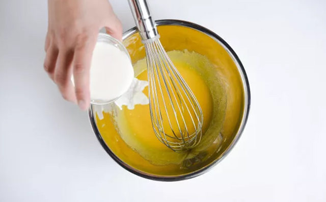 3 / 將攪打好的蛋黃液加入植物油攪拌均勻。